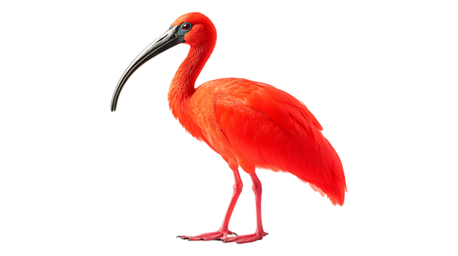 Isolated Scarlet ibis bird standing with one leg raised and long curved beak, nature wildlife