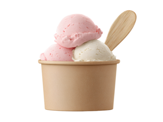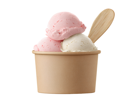 Ice Cream Tub with One Pink and Two White Scoops Stacked on Top, Wooden Spoon Inserted, Front View, Isolated on Transparent Background