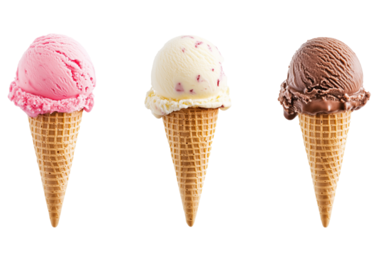 five different flavors of ice cream in a waffle cone, isolated on transparent background