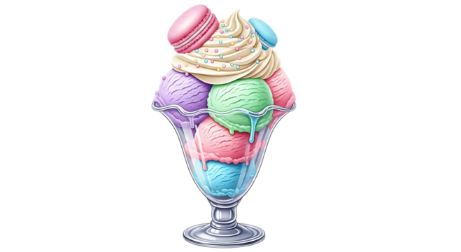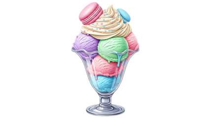 Colorful ice cream parfait with macarons and whipped cream, isolated on transparent background