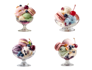 Four Vibrant Gourmet Ice Cream Sundaes Garnished with Macarons and Fresh Berries isolated on a transparent background