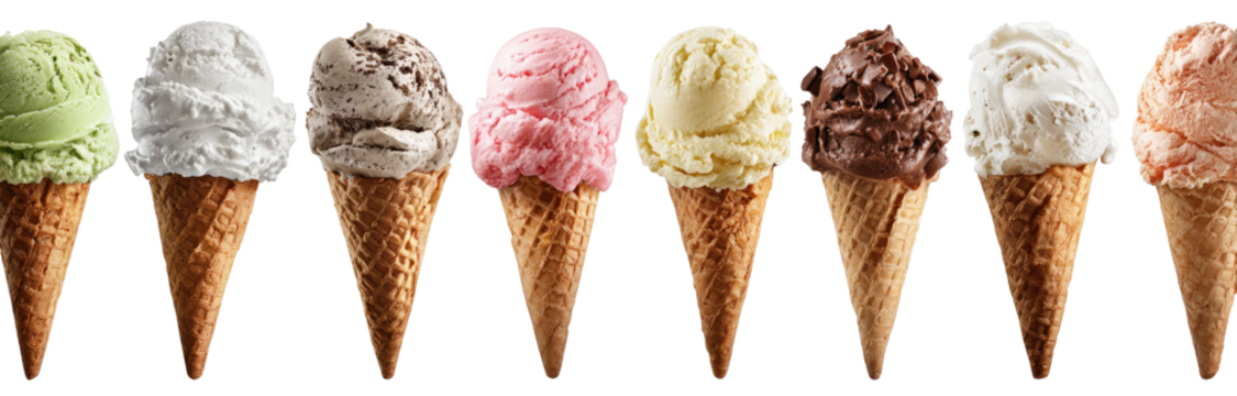 Ice cream scoop on waffle cone on transparent background easy cutout, PNG AI. Many assorted different flavor Mockup templates for artwork design.