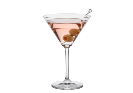 Isolated olive martini in a glass with pick, an aperitif or cocktail against a plain background