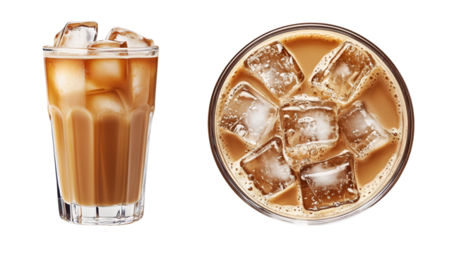 Iced drink with ice cubes in a tall glass on white backdrop, PNG, created with Generative AI