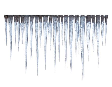 Close-up view of a cluster of transparent icicles hanging downwards, captured against a black background