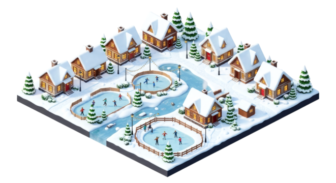 charming isometric winter village ice skating fun, cozy snow covered houses, festive holiday spirit, isolated on transparent background