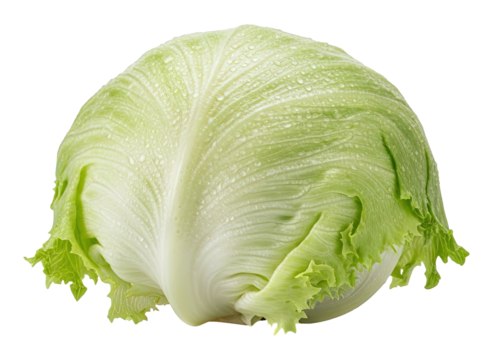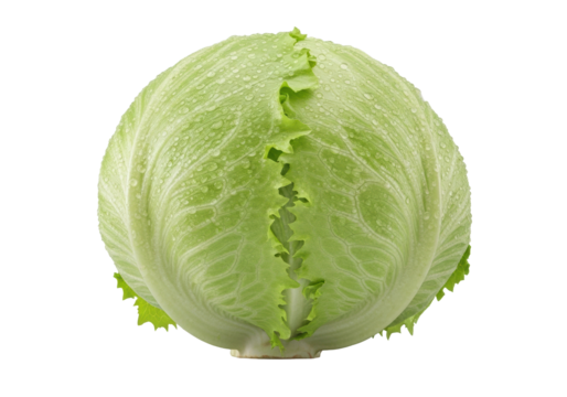 Whole, pristine head of crisp iceberg lettuce with vibrant light green outer leaves and glistening water droplets, on a clean, seamless transparent background, bright studio lighting. Concept for