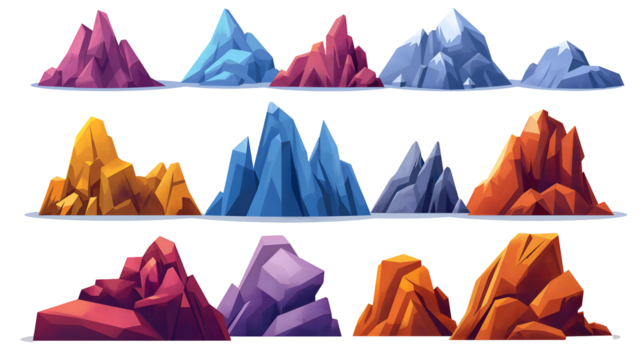 Collection of stylized low poly fantasy game assets depicting various sharp colorful mountain ranges and crystalline icebergs isolated on a dark background