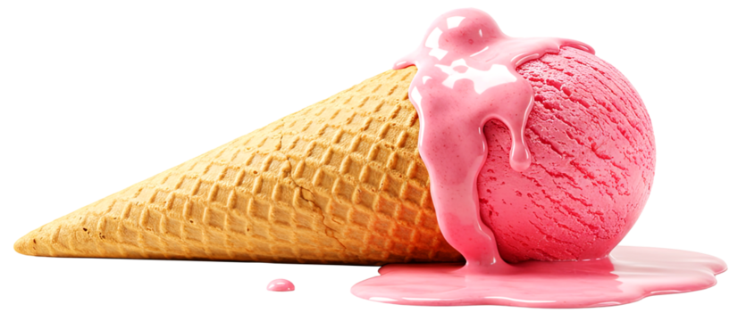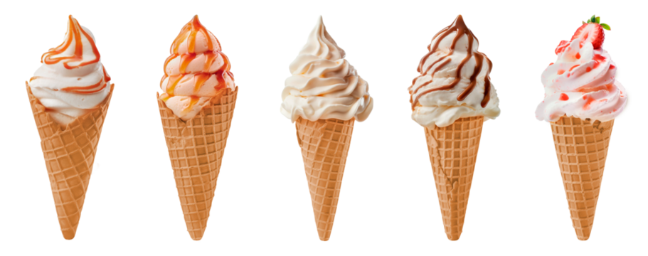 five different flavors of ice cream in a waffle cone, isolated on transparent background
