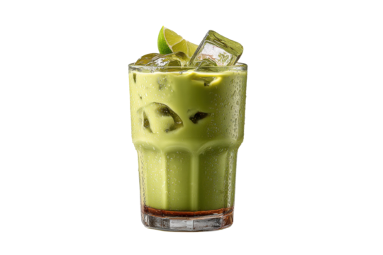 PNG Refreshing iced matcha latte with lime and ice cubes on black background