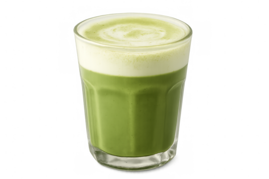 Iced matcha latte in glass isolated, refreshing green tea drink with milk and ice cubes