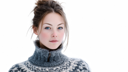 Icelandic woman wearing a traditional icelandic sweater with transparent background, perfect for easy integration into any design project, adding a touch of nordic charm