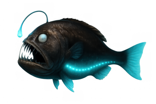 Side view of a bioluminescent anglerfish swimming in the dark, isolated on transparent background