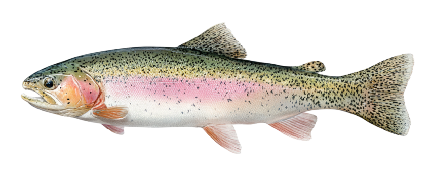 A detailed illustration of a rainbow trout swimming