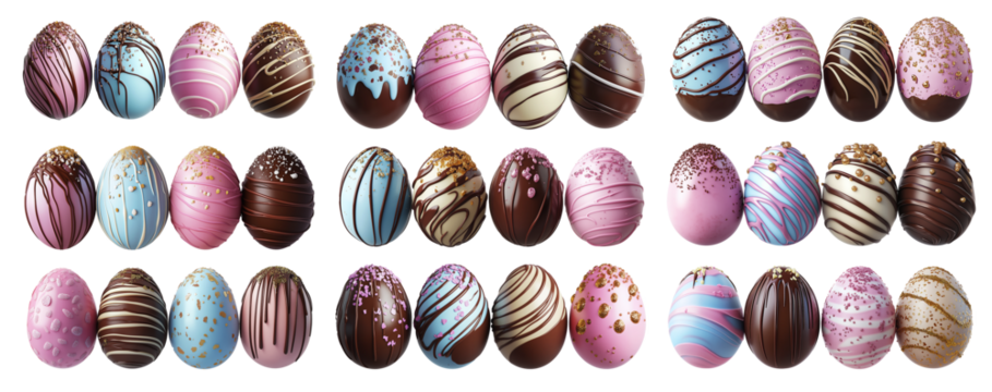 Luxurious chocolate Easter eggs with pastel and dark chocolate coatings, isolated on white background