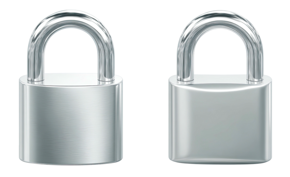 Two shiny silver padlocks side-by-side, reflecting light on a transparent background