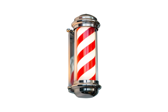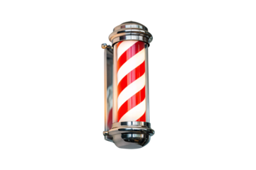 Traditional barber shop pole, red white striped cylinder, chrome caps, vintage barbershop sign, classic advertising, isolated on a transparent background