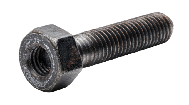 Industrial steel bolt joining with a nut, showing rust texture and threaded design. Metal construction hardware element