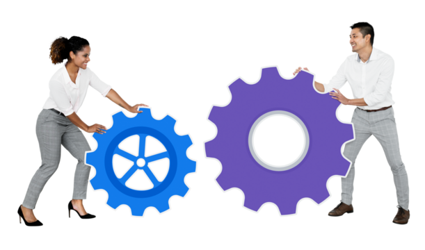 Png Businesspeople connecting blue and purple gear icons, transparent background