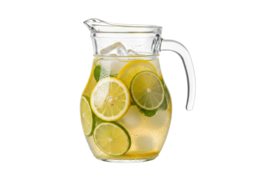 Photorealistic glass pitcher filled with icy pale yellow lemonade, citrus slices, and mint sprigs, condensation dripping, isolated on a glossy white studio background. Concept for cold refreshment