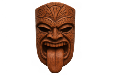 Wooden tiki mask with tongue out for polynesian culture promoting ancient warrior traditions and spiritual beliefs