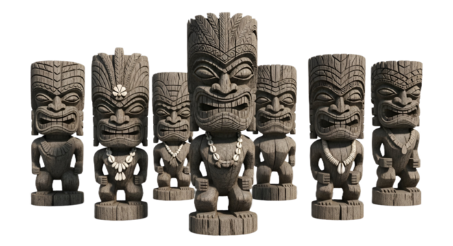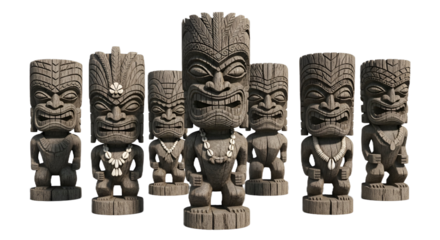 Four ancient stone tiki statues with fierce expressions isolated on transparent background