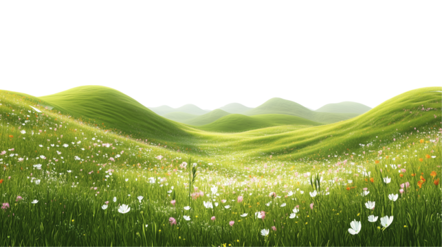 Green Hills with Wildflowers Isolated on White and Transparent Background