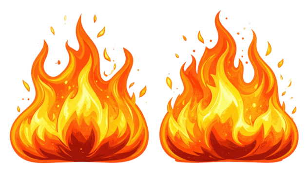 Two cartoon flames burning brightly, with vivid orange and yellow hues, and small sparks floating around them