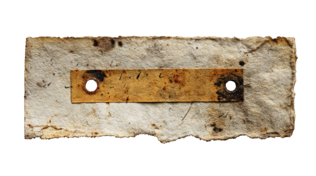 A piece of aged paper with a brown stripe and two holes, showcasing wear and historical character.