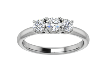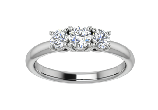silver engagement ring with three diamonds, luxury jewelry isolated on white background