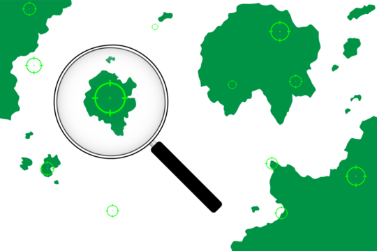map and magnifier searching target in the world, green and blue background, finding customer for business, marketing, promotion by accurate. search target on world map with magnifying glass, vector il