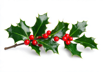 A single sprig of lush green holly with bright red berries isolated on transparent background