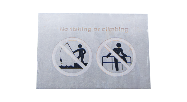 Sign aluminum No fishing or climbing isolated on cut out PNG or transparent background. Warning of prohibited area playing various devices. Regulations must be followed installed along river and fence