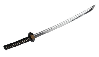 Sharp gleaming katana sword with traditional black wrapped handle and detailed tsuba ready for action