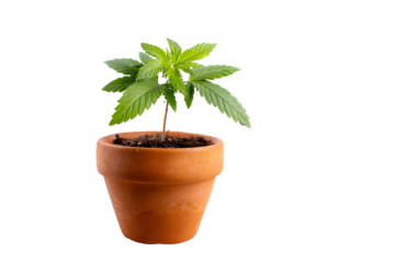 Small Cannabis Plant Seedling in Clay Pot, isolated on transparent background