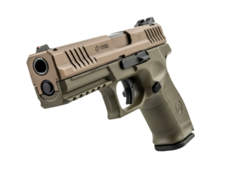 Isolated automatic handgun on display, firearm for defense and self protection in khaki color
