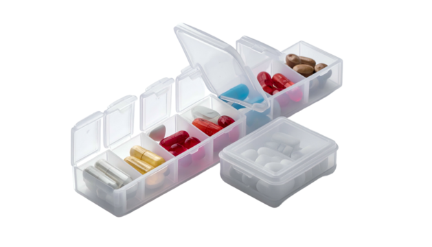 Open pill organizer filled with colorful capsules and tablets