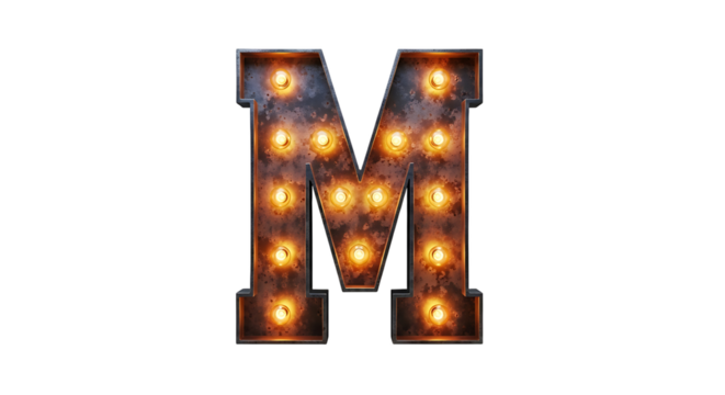 Marquee Light Bulb Letter M Vintage Rusty Metal Alphabet on Black Background