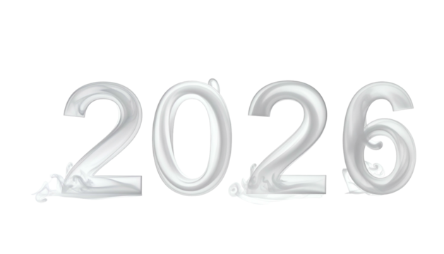 The year 2026, rendered in a shiny, liquid-like, silver font