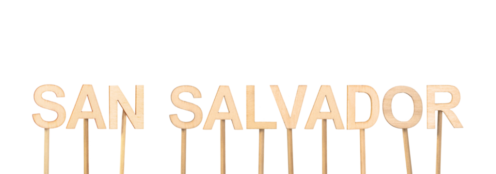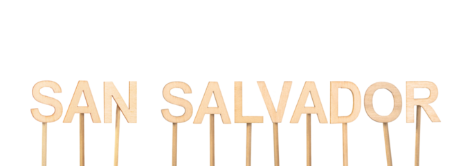 Text forming the name of San Salvador, capital of El Salvador, in light wooden letters on white background
