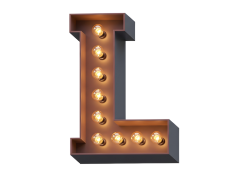 Vintage Steampunk Letter 'L' with Illuminated Incandescent Bulbs in Old American Road Sign Style on Transparent Background