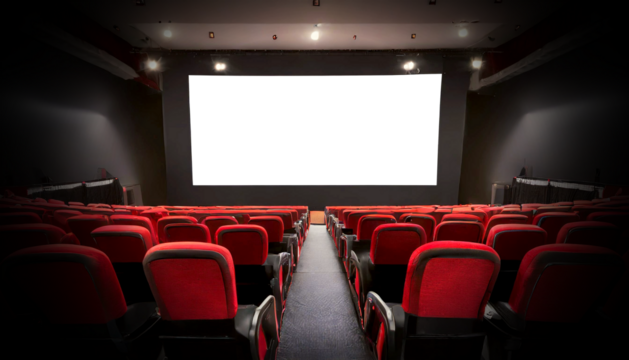 Movie theater with black and red cinema seats and empty screen with copy space, isolated on white or transparent background, png. Generative Ai.