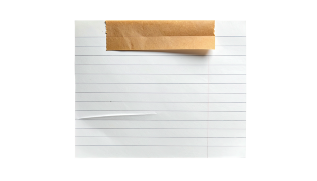 A blank lined paper sheet, torn and taped with a brown piece of tape, isolated on black