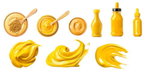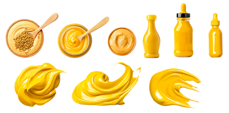 Various yellow mustard presentations including jars, bowls, spoons, and bottles isolated on white background, illustrating condiment variety and food concept