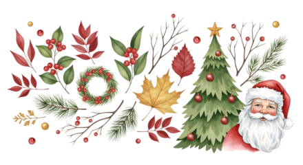 Watercolor illustration of christmas elements including santa claus, a decorated christmas tree, festive foliage, berries, and branches, isolated on transparent background
