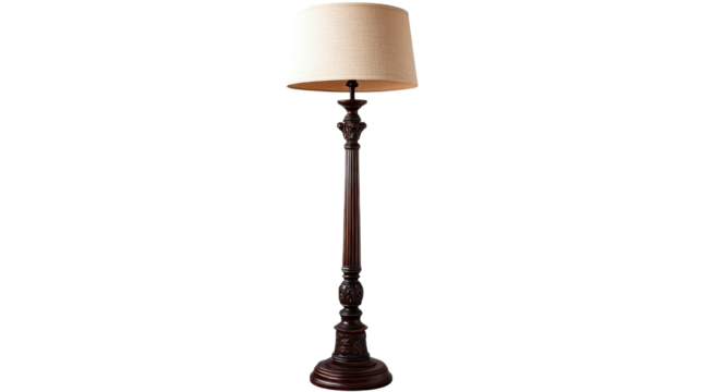 Classic vintage-style floor lamp with ornate base and beige shade Transparent background, PNG