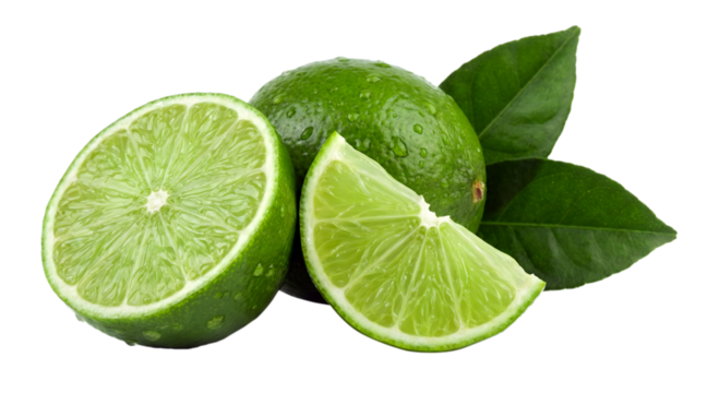 arrangement photograph of whole and sliced limes including a fresh leaf, featuring water droplets and vibrant green color, isolated on transparent background.
