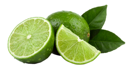 arrangement photograph of whole and sliced limes including a fresh leaf, featuring water droplets and vibrant green color, isolated on transparent background.