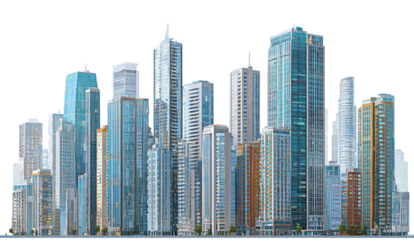 Digital illustration of modern city buildings on transparent background