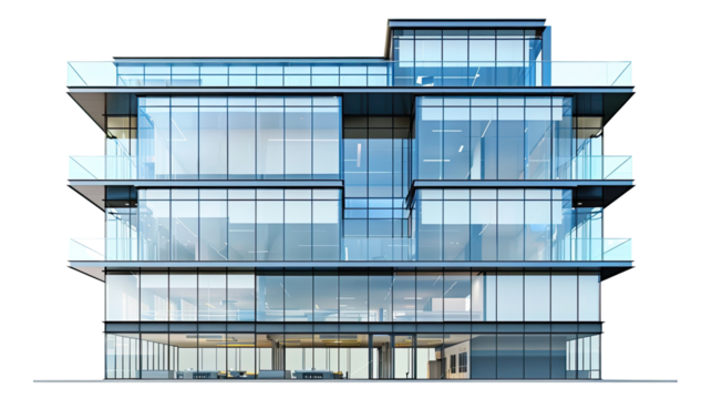 Transparent high-rise modern office building in urban scene